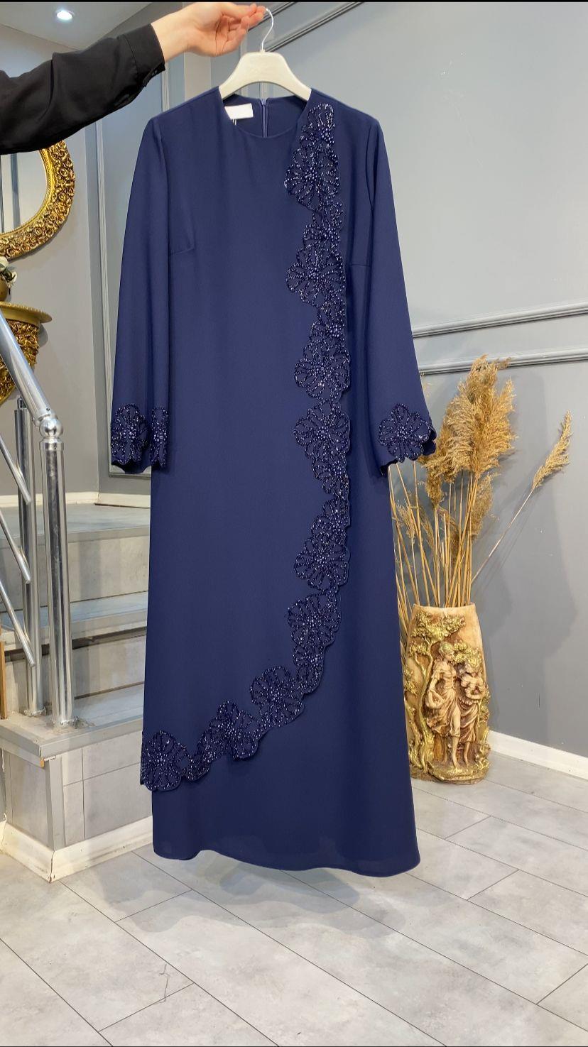 NEVON 7245 ÖNÜ VE KOLU TAŞ İŞLEME DETAYLI ÇİÇEK DESENLİ KREP ELBİSE (7245)